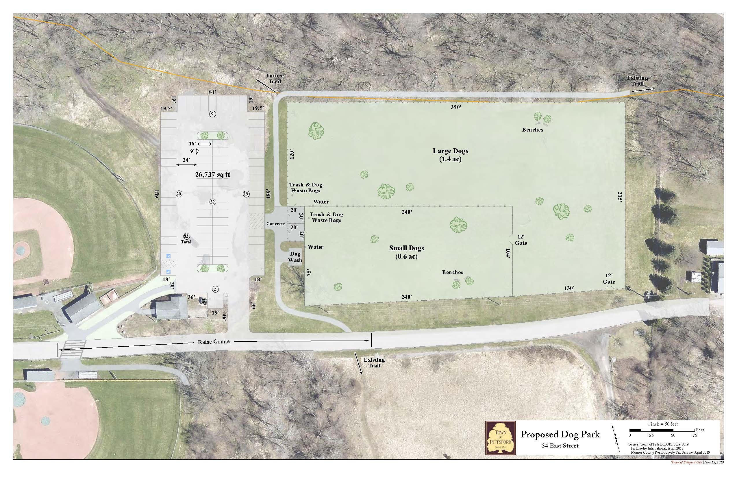 The Pittsford Town Dog Park will have two off-leash areas, one each for large and small dogs. Dogs will have access to play structures and water fountains. Dog owners will be able to relax on benches and use picnic tables under shade trees. The facility will include a dog wash station to hose off muddy paws and coats. The park is located on the Town’s trail system.